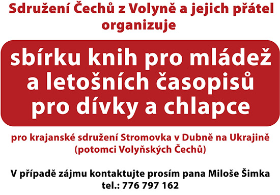 Sdružení Čechů z Volyně a jejich přátel organizuje sbírku knih pro mládež a letošních časopisů pro dívky a chlapce pro krajanské sdružení Stromovka v Dubně na Ukrajině (potomci Volyňských Čechů). V případě zájmu kontaktujte prosím pana Miloše Šimka tel.: 776 797 162