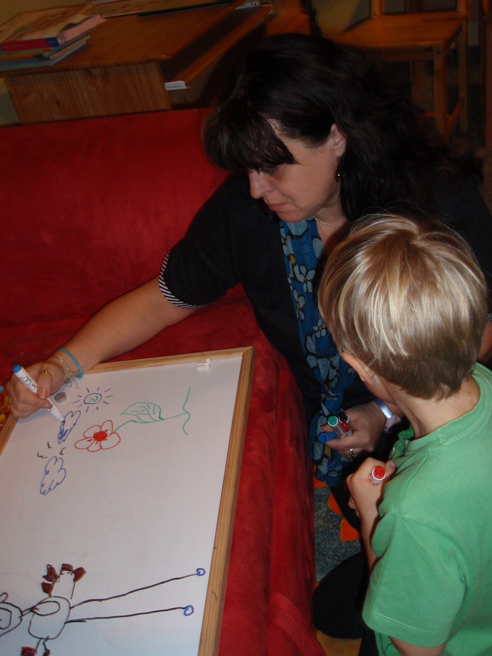 Milí rodičové, chtěla bych Vás seznámit s úvodní spoluprací v rámci konzultační individuální hodiny věnované dítěti. Rozhovor s chlapcem proběhl v běžném pracovním týdnu a odpoledne v mé pracovně. Cílem rozhovoru bylo navázat s dítětem kontakt, spolupráci v klidném prostředí a zjistit jeho verbální a neverbální projevy. V rozhovoru byly použity otevřené (odpovědi ve formě ano – ne – nevím) a uzavřené (obšírnější odpovědi) otázky. Po představení se, oční kontakt byl navázán a poměrně rychle, mile se na mě usmíval a ihned mi kladl otázky. Vzápětí jeho maminka vše uvedla na pravou míru : „teta nám bude pomáhat a bude si s tebou povídat a hrát si“. Poté, chlapec sám navrhl, abychom si spolu kreslili. Během kreslení jsem využila chvíle klidu a začala jsem mu pokládat otázky. V procesu dění se snažil odpovídat, ale příliš mu to nevyhovovalo. Z toho vyplývá základní pravidlo : Vždy je třeba respektovat soustředěnost pozornosti pro danou činnost. Můžeme to nazvat osvědčenou pedagogickou zkušeností : „Dítě v činnosti přemýšlí, a pokud je do ní ponořeno, není správné ho rušit, způsobujeme mu tím do budoucna problémy v potřebné délce procesu pozornosti, která v daném momentě je pro něj velmi důležitá. Tzv. tenacita pozornosti je časový úsek schopnosti, natrvalo udržet pozornost, která se pravidelným tréninkem prodlužuje. V období školního věku ji efektivně využívá ve prospěch dětského, vlastního zájmu o učení. Lidově řečeno : „již ukazujeme dítěti, co je respektovat jeden druhého a do budoucna přecházíme k trvalé vzájemné úctě mezi dítětem a dospělým. “ Kreslené zvíře, různé věci dítě imponovaly více, než-li má přítomnost. Do svých obrázků vsouval fantazii a cítil se uvolněně. Působilo to, jako když on je ten, který vede úvodní rozhovor. Situace byla obohacujícím zážitkem. Až v závěru jsme spolu byli schopni zformulovat odpovědi. Hodina proběhla nikoliv dle dospělé osoby, ale dle potřeb dítěte. Respektovala jsem jeho chování a jednání. Velkou pozornost věnuji neverbálním projevům : pokukování, klidné oči, zda obličej vyzařuje dětskou radost apod. Vždy vnímám i verbální projevy.