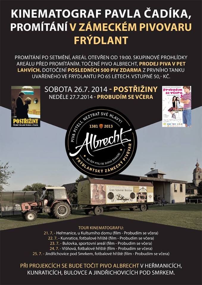 Po oba dva dny začíná promítání po setmění, areál Zámeckého pivovaru Frýdlant bude každý den otevřen od 19.00 hodin. Připraveno je k dotočení zdarma ještě 500 piv z prvního uvařeného tanku ve Frýdlantu. Až se vypijí, bude samozřejmě k dispozici další pivo prodávané za příznivé ceny, koupit si mohou na místě zájemci i piva Albrecht v pet lahvích.