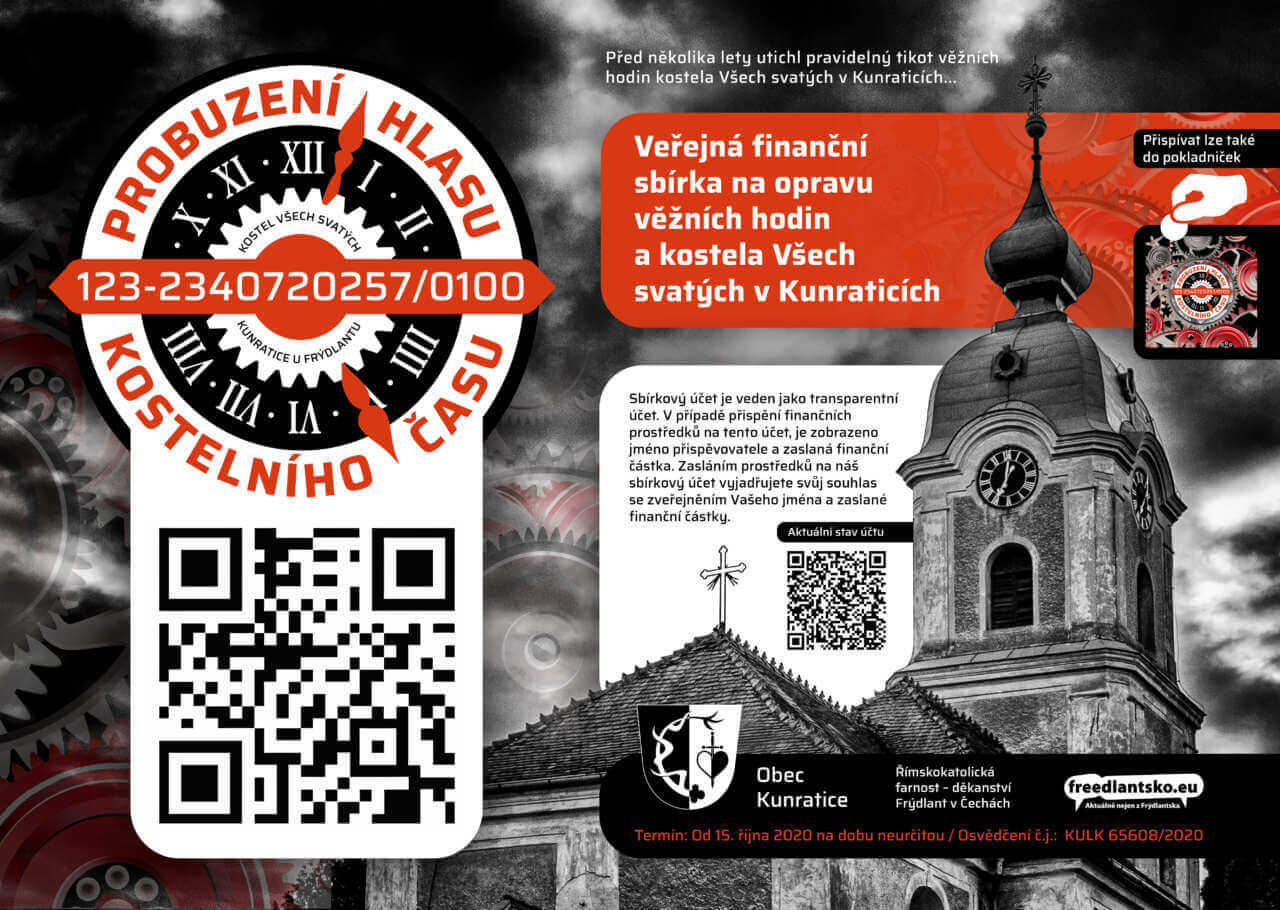 Účel sbírky: Oprava věžních hodin a kostela Všech svatých v Kunraticích
