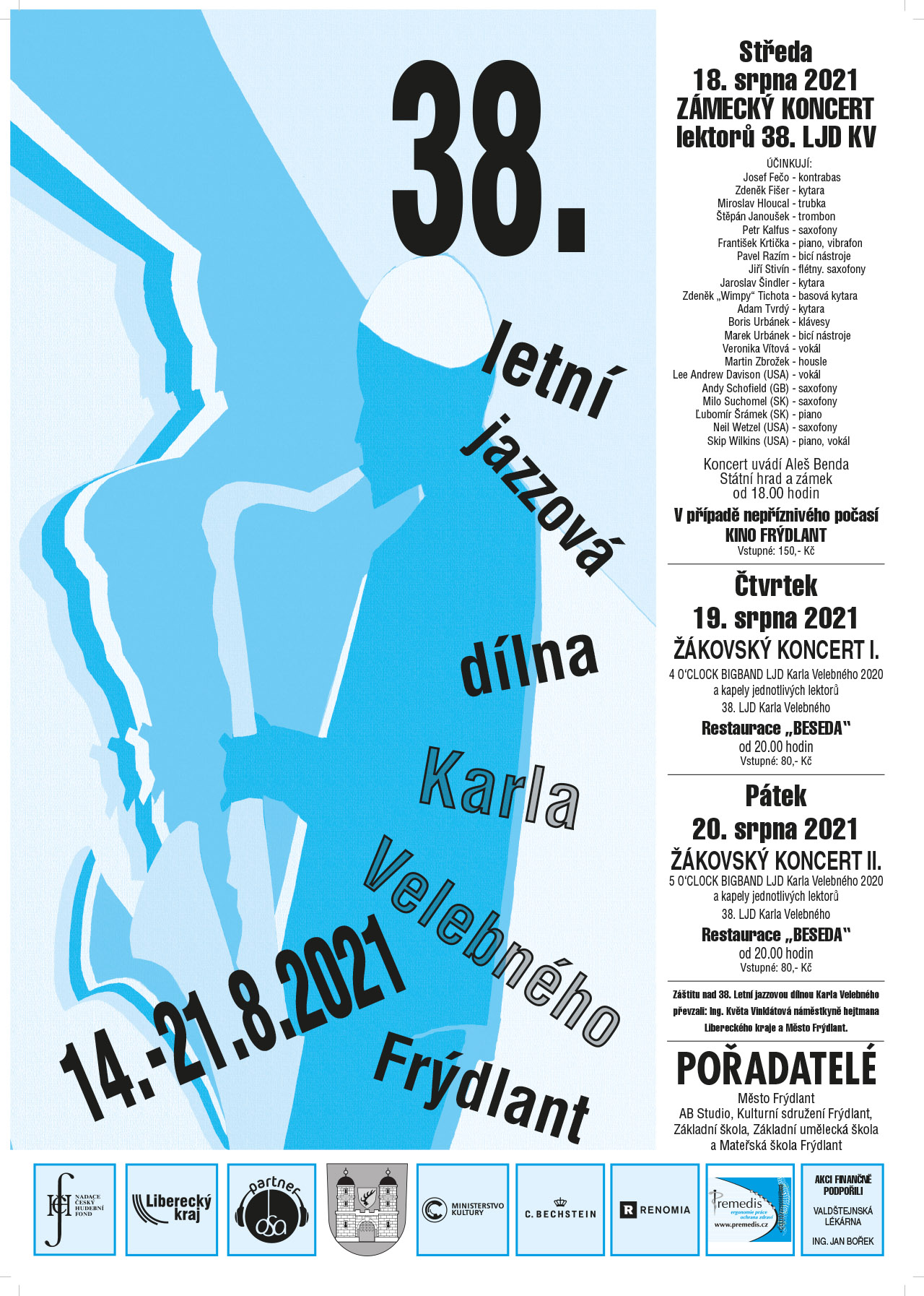 Už v sobotu 14. srpna 2021 se začnou do Frýdlantu opět sjíždět jazzoví nadšenci z České republiky i zahraničí, aby se tu na týden stali součástí největší jazzové školy u nás – Letní jazzové dílny Karla Velebného (LJD). Ta bude probíhat až do soboty 21. srpna 2020. Osmatřicátého ročníku LJD se zúčastní více než dvě stovky mladých ctitelů jazzu z České republiky, Slovenska, Německa a Itálie. Veřejnost se může těšit především na koncert na zámku, který začíná ve středu 18. srpna 2021 v 18.00 hodin.