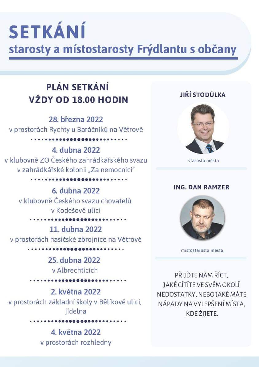 Pro občany jsou tato setkání v terénu další možností, jak se bez předem naplánované schůzky se starostou nebo místostarostou Frýdlantu potkat. „Běžně za námi lidé mohou přijít bez předem domluvené schůzky vždy každou první středu v měsíci od 16.00 do 18.00 hodin v rámci akce Dveře dokořán. Na jaře ale tyto dveře dokořán v našich kancelářích v prvním patře radnice rádi měníme za setkání s lidmi v terénu. Jednak jich tam přijde vždy více a pak je to také jiný druh setkání a vždy se na nich dozvíme spoustu zajímavých a užitečných věcí o životě obyvatel v té které části města,“ vysvětluje místostarosta Frýdlantu Ing. Dan Ramzer.