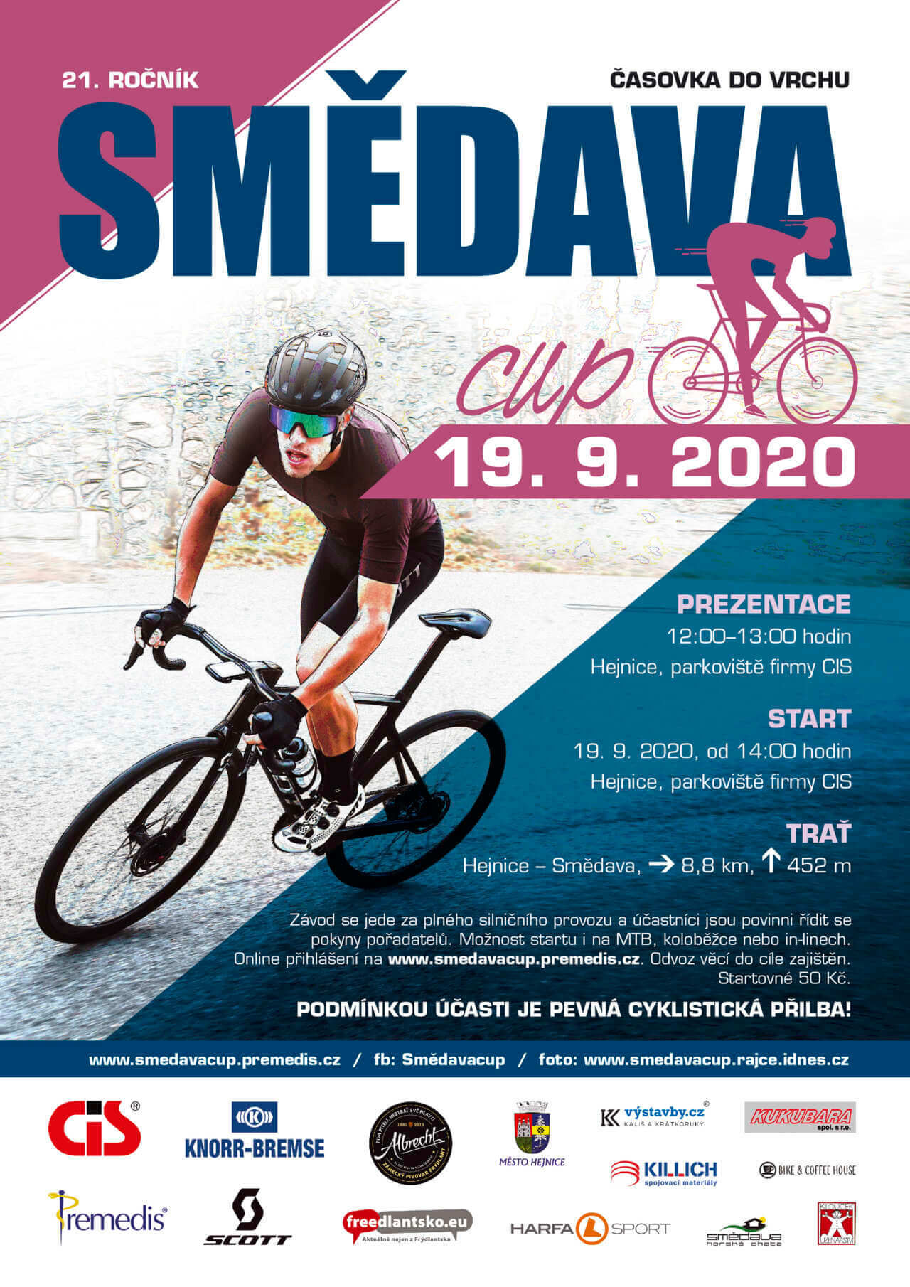 Závod se jede za plného silničního provozu a účastníci jsou povinni řídit se pokyny pořadatelů. Možnost startu i na MTB, koloběžce nebo in-linech. Online přihlášení na www.smedavacup.premedis.cz. Odvoz věcí do cíle zajištěn. Startovné 50 Kč.