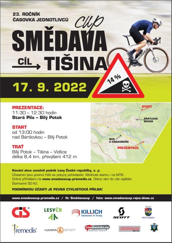 Smědavacup Vás srdečně zve na na 23. ročník tradiční časovky do vrchu pro jednotlivce. Smědavacup 2022 – časovka na Tišinu 17. září 2022. PREZENTACE 11.30 – 12.30 hodin