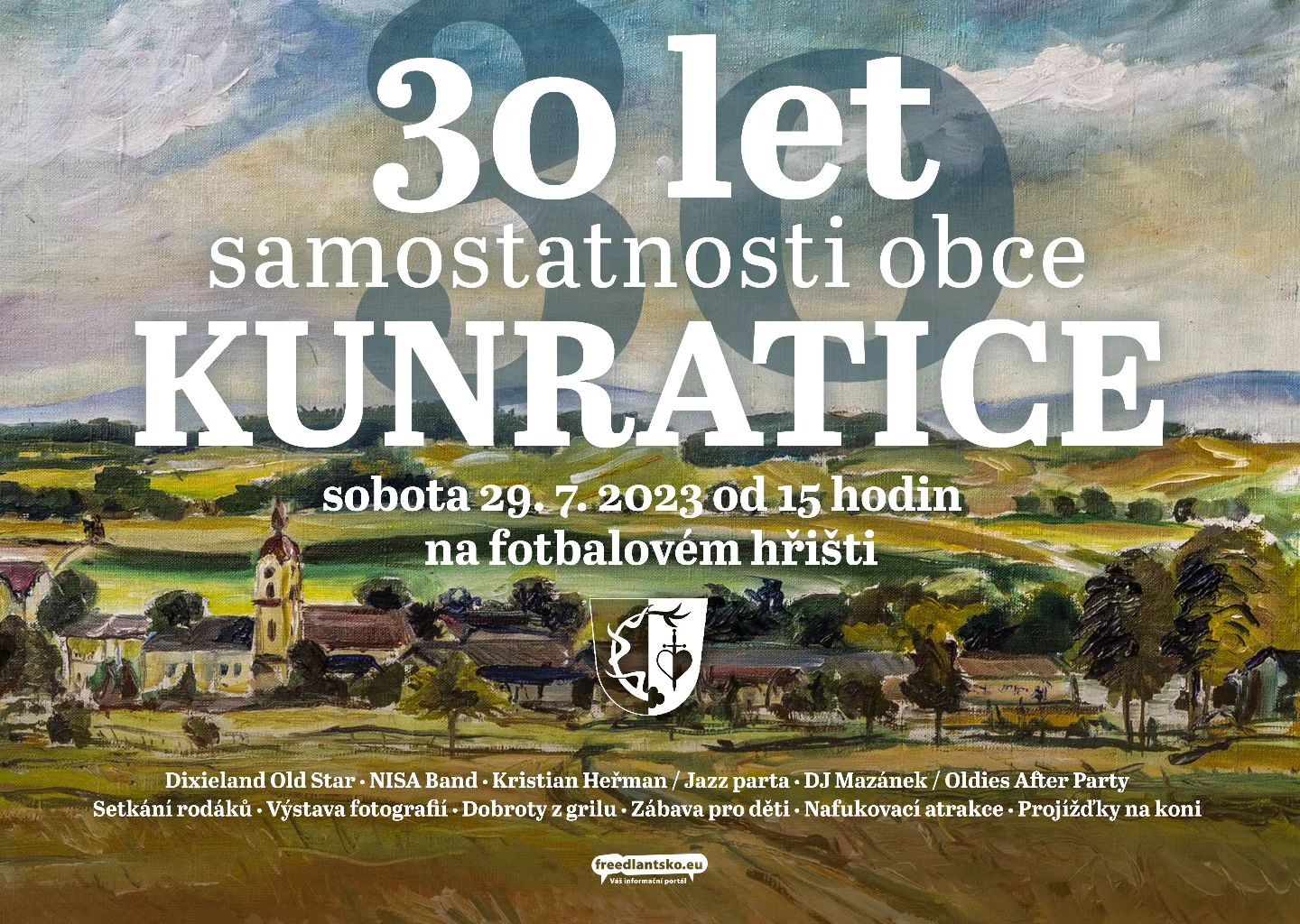 Obec Kunratice vás srdečně ve na oslavu třicátin – 30 let samostatnosti obce Kunratice dne 29. července 2023 od 15.00 hodin na fotbalové hřiště.