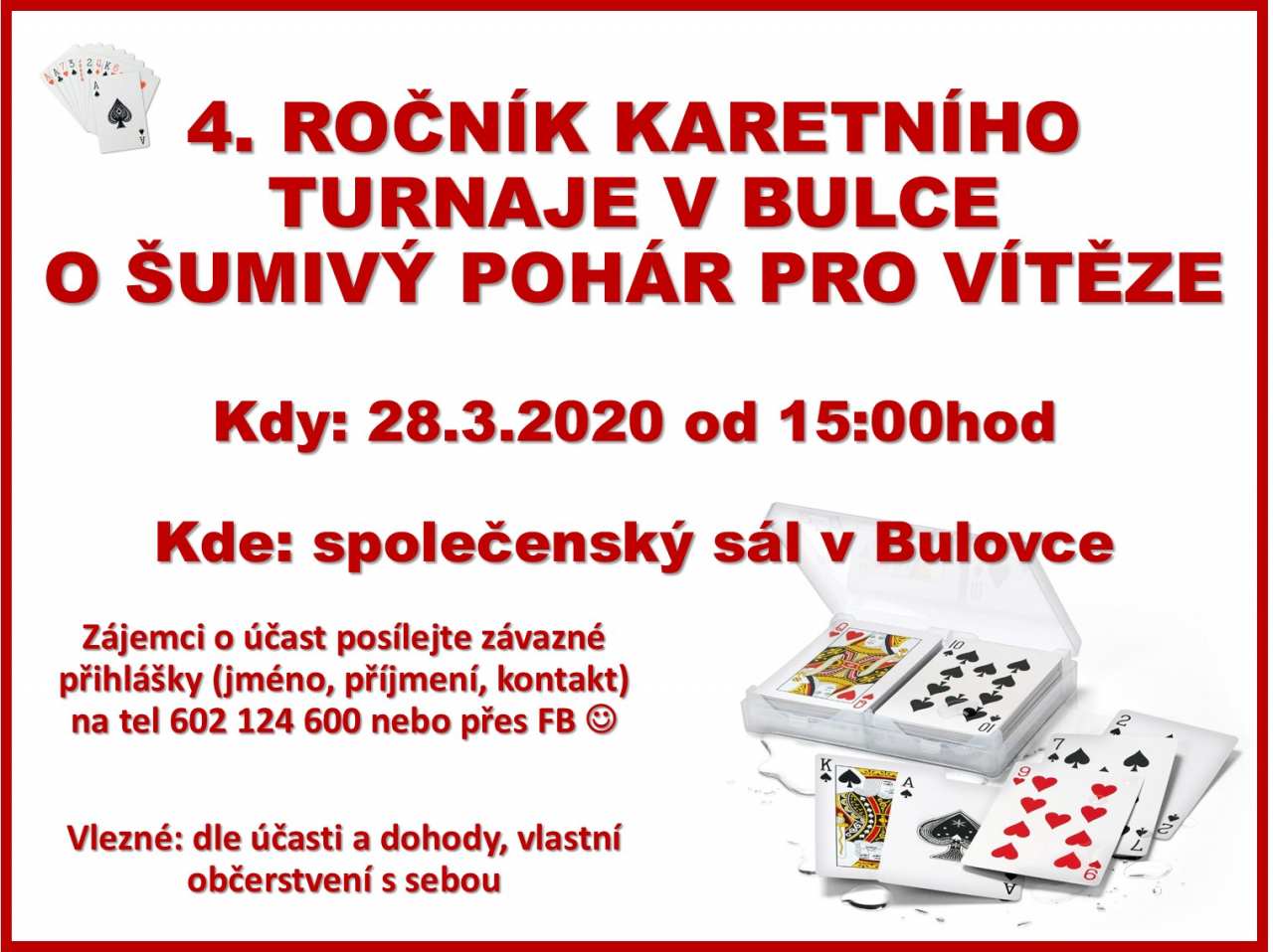 2020so28březen15.0022.004. ročník Karetního turnaje v BulceBulovka - Obecní úřad, Bulovka 101, 464 01 Bulovka, Liberecký kraj15.00 - 22.00(GMT+01:00) Druh akceParty,Společenská akce