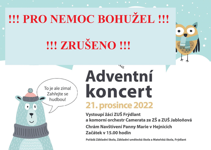 Římskokatolická farnost Hejnice, Raspenava a Mníšek vás srdečně zve na Adventní koncert žáků základních uměleckých škol. Účinkují: ZUŠ Frýdlant a komorního