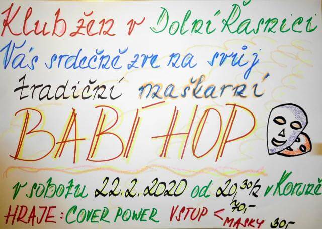 Klub žen v Dolní Řasnici Vás srdečně zve na tradiční maškarní Babí hop. K tanci a poslechu Vám zahraje skupina COVER POWER. Vstupné je 70 Kč, pro masky 30 Kč.