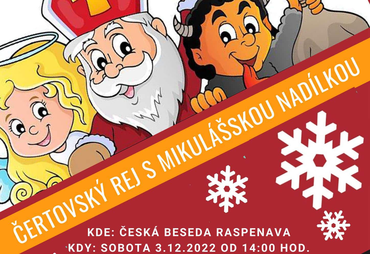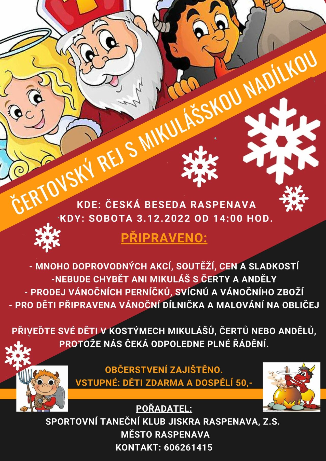 KDE: Česká Beseda Raspenava KDY: sobota 3. prosince 2022 od 14.00 hodin Připraveno: * mnoho doprovodných akcí, soutěží, cen a sladkostí * nebude chybět ani Mikuláš s čerty a anděly * prodej vánočních perníčků,