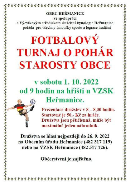 Obec Heřmanice s Výcvikovým střediskem služební kynologie Heřmanice pořádá pro všechny fanoušky sportu a legrace tradiční Fotbalový turnaj o pohár starosty obce v sobotu 1. října 2022 od 9.00 hodin na