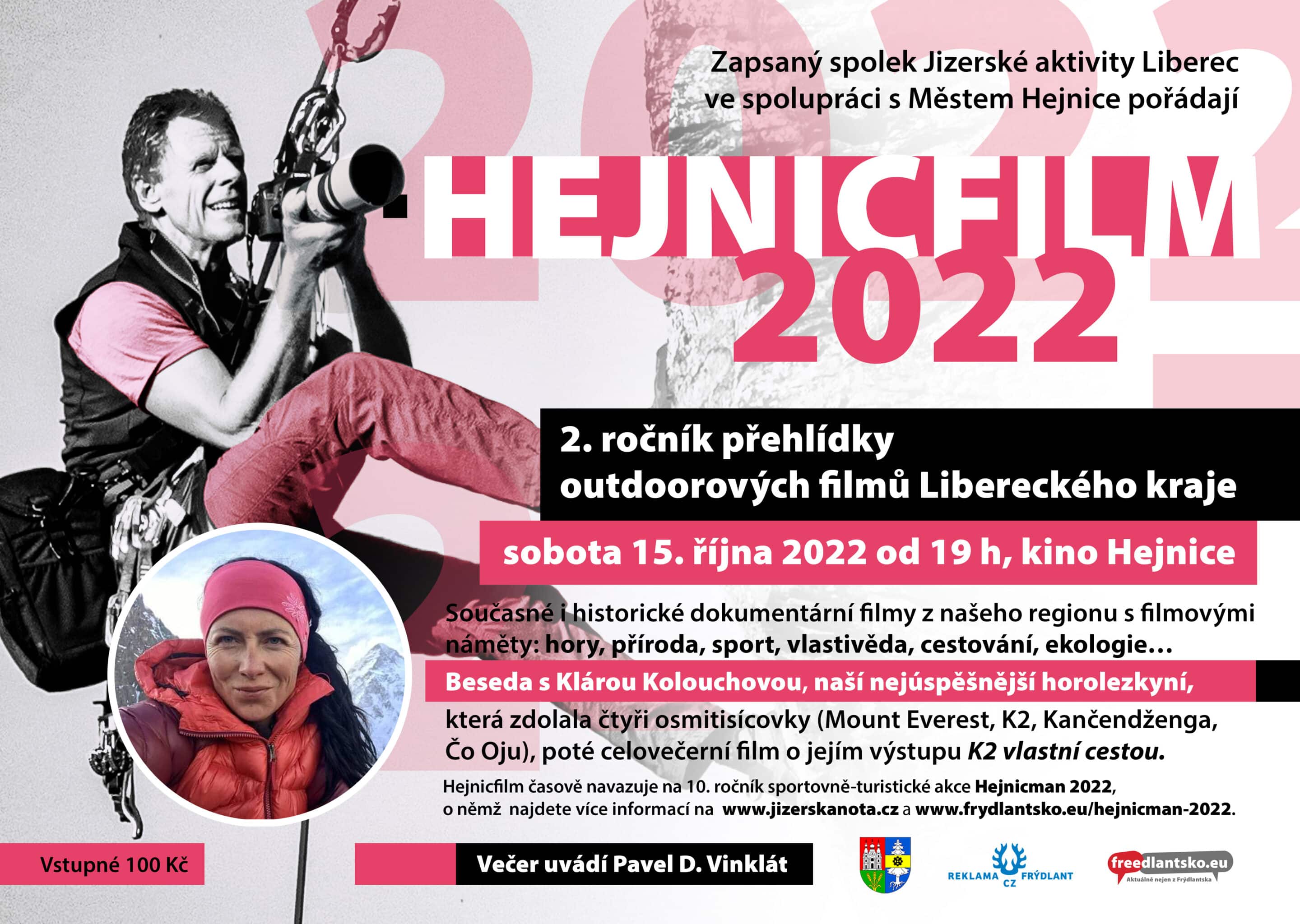 Zapsaný spolek Jizerské aktivity ve spolupráci s Městem Hejnice pořádají Hejnicfilm 2022 2. ročník přehlídky outdoorových filmů Libereckého kraje v sobotu 15. října 2022 od 19 hodin v kině Hejnice. Současné