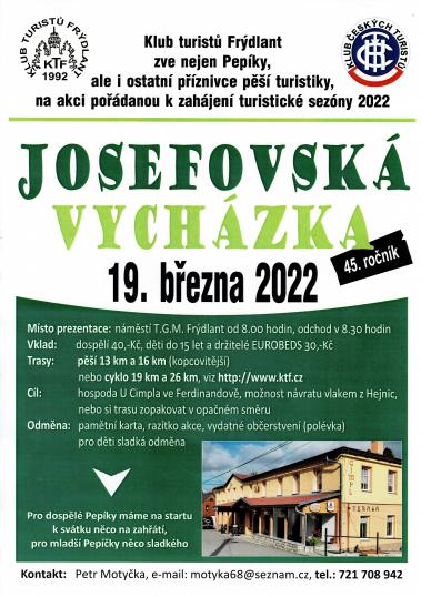 Klub českých turistů Frýdlant vás zve na již 45. ročník tradiční akce k zahájení turistické sezóny 2022 – Josefovskou vycházku. Akce se koná dne 19. března 2022. Od 8.00 hodin je