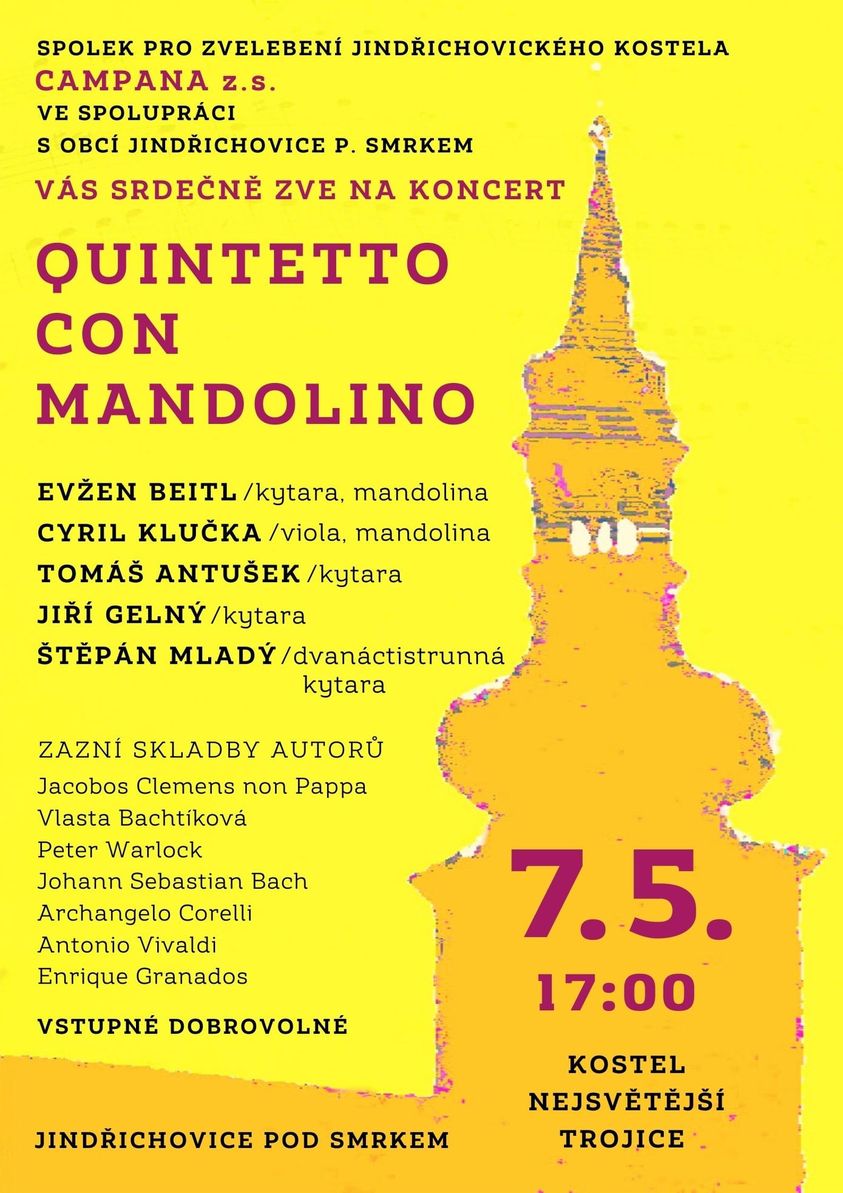 Spolek pro zvelebení jindřichovického kostela Campana, z.s. vás v sobotu 7. května 2022 od 17.00 hodin srdečně zve na koncert Quintetto con mandolino. Naši milí, v krátké době se hlásíme