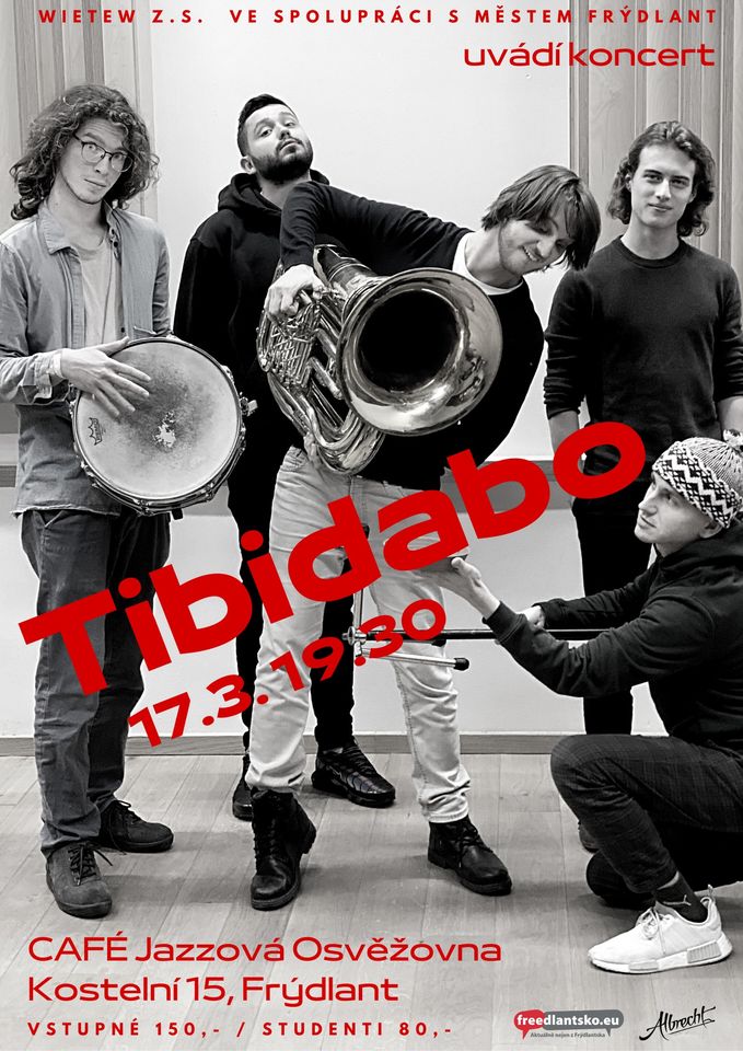 Hudební uskupení Tibidabo vzniklo na jaře 2022 a jeho poslání bylo od počátku jasné: šířit hudbu významného českého multiinstrumentalisty a skladatele Karla Velebného. Tento úkol plní členové souboru s nadšením a dalo by se říci i celkem obstojně. Můžete se těšit na pořádnou dávku jazzové improvizace v podání Vojtěcha Kadaňky na trubku, Davida Le Cama na altový saxofon, Matěje Kolaříka na baskytaru, Adama Štoly na bicí a Jiřího Pokorného na klavír.