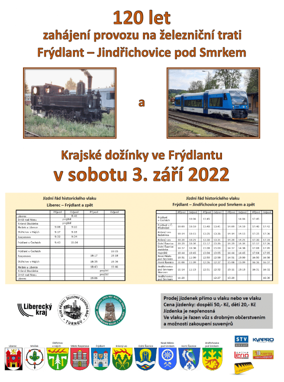 Krajské dožínky Libereckého kraje se uskuteční 3. září 2022 ve Frýdlantu. 120 let zahájení provozu na železniční trati Frýdlant_ Jindřichovice pod Smrkem. Vlak je součástí oslav Krajských