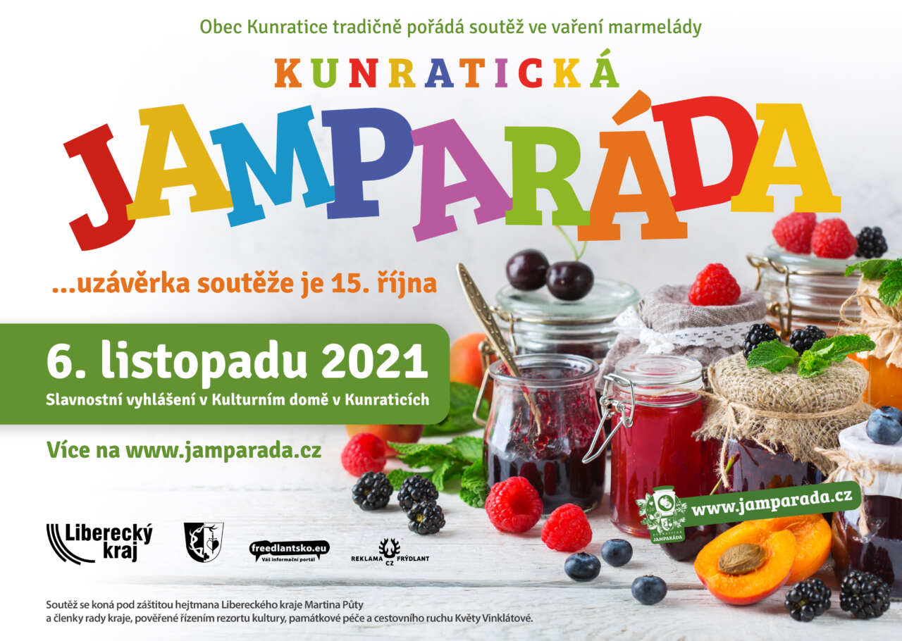 Obec Kunratice tradičně pořádá soutěž ve vaření marmelády Kunratická JamParáda 2021 Sobota 6. 11. 2021 / Veřejná ochutnávka od 15 hod / Vyhlášení v 17 hod v Kulturním domě v Kunraticích. Soutěž