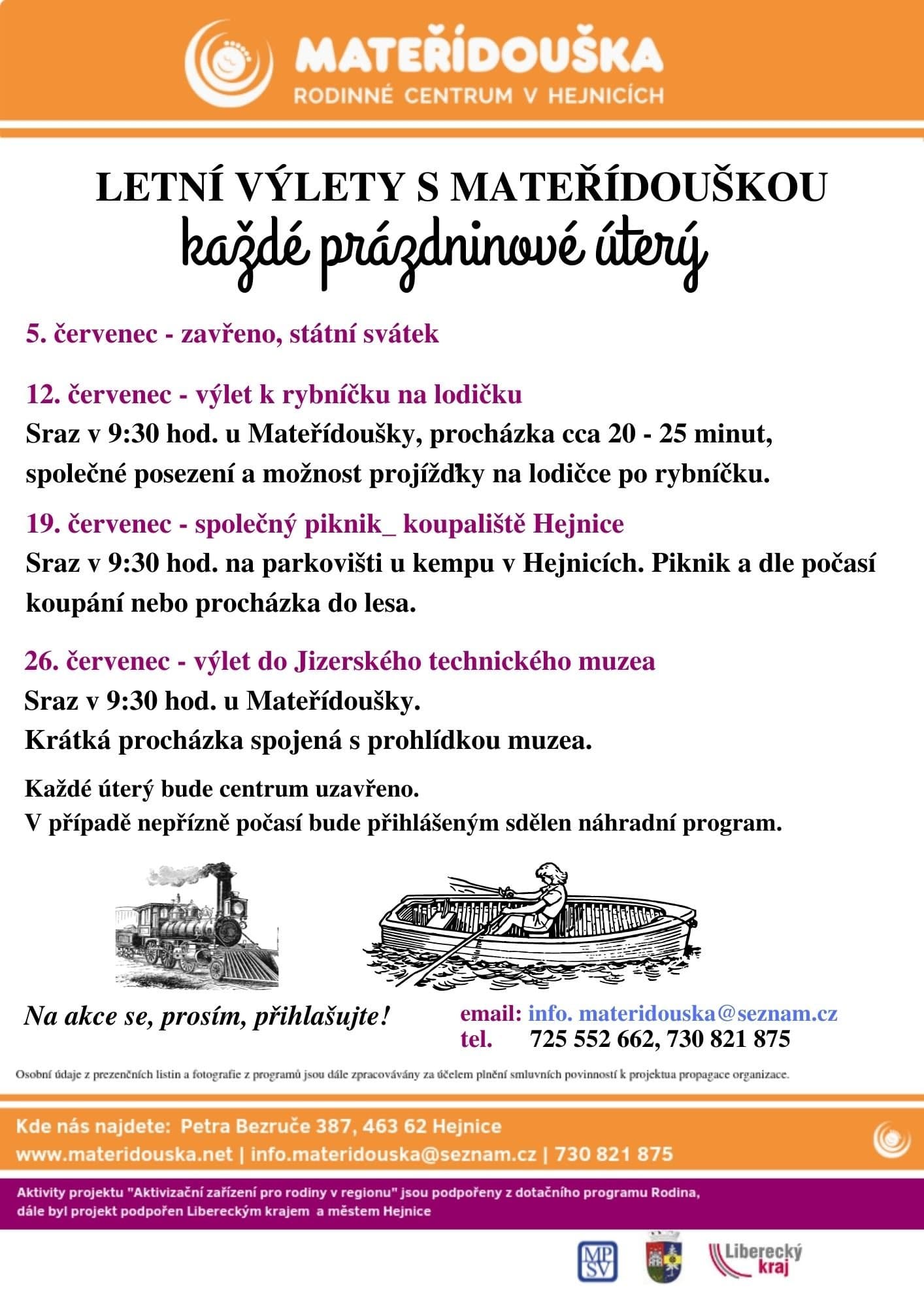 Program letních výletů s rodinným centrem Mateřídouška v Hejnicích v měsíci červenci 2022.