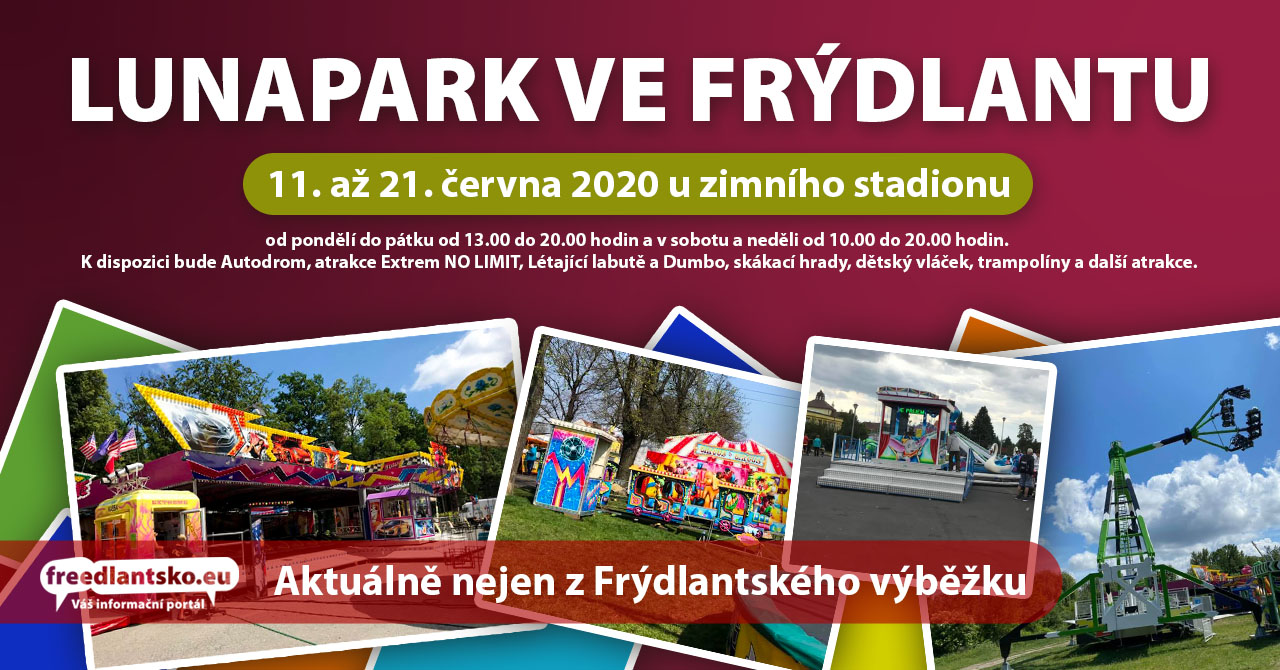 Do Frýdlantu přijede 11. června lunapark. U zimního stadionu budou atrakce až do 21. června a to denně od pondělí do pátku od 13.00 do 20.00 hodin a v sobotu a neděli od 10.00 do 20.00 hodin. K dispozici bude Autodrom, atrakce Extrem NO LIMIT, Létající labutě a Dumbo, skákací hrady, dětský vláček, trampolíny a další atrakce.