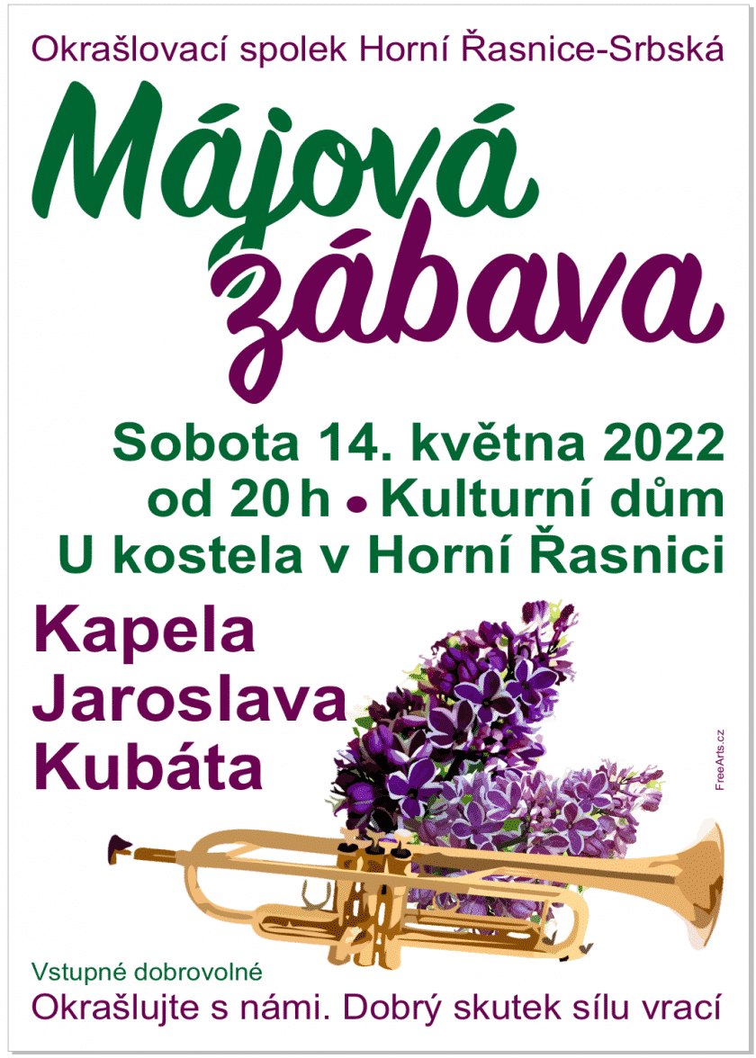 Okrašlovací spolek Horní Řasnice – Srbská vás zve v sobotu 14. května 2022 od 20.00 hodin na na Májovou veselici do domu kultury u kostela.