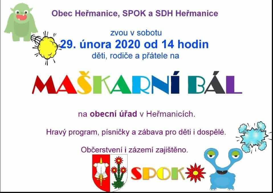 Obec Heřmanice, SPOK a SDH Heřmanice zvou v sobotu 29. února 2020 od 14 hodin děti, rodiče, přátele na Maškarní bál na Obecní úřad v Heřmanicích.