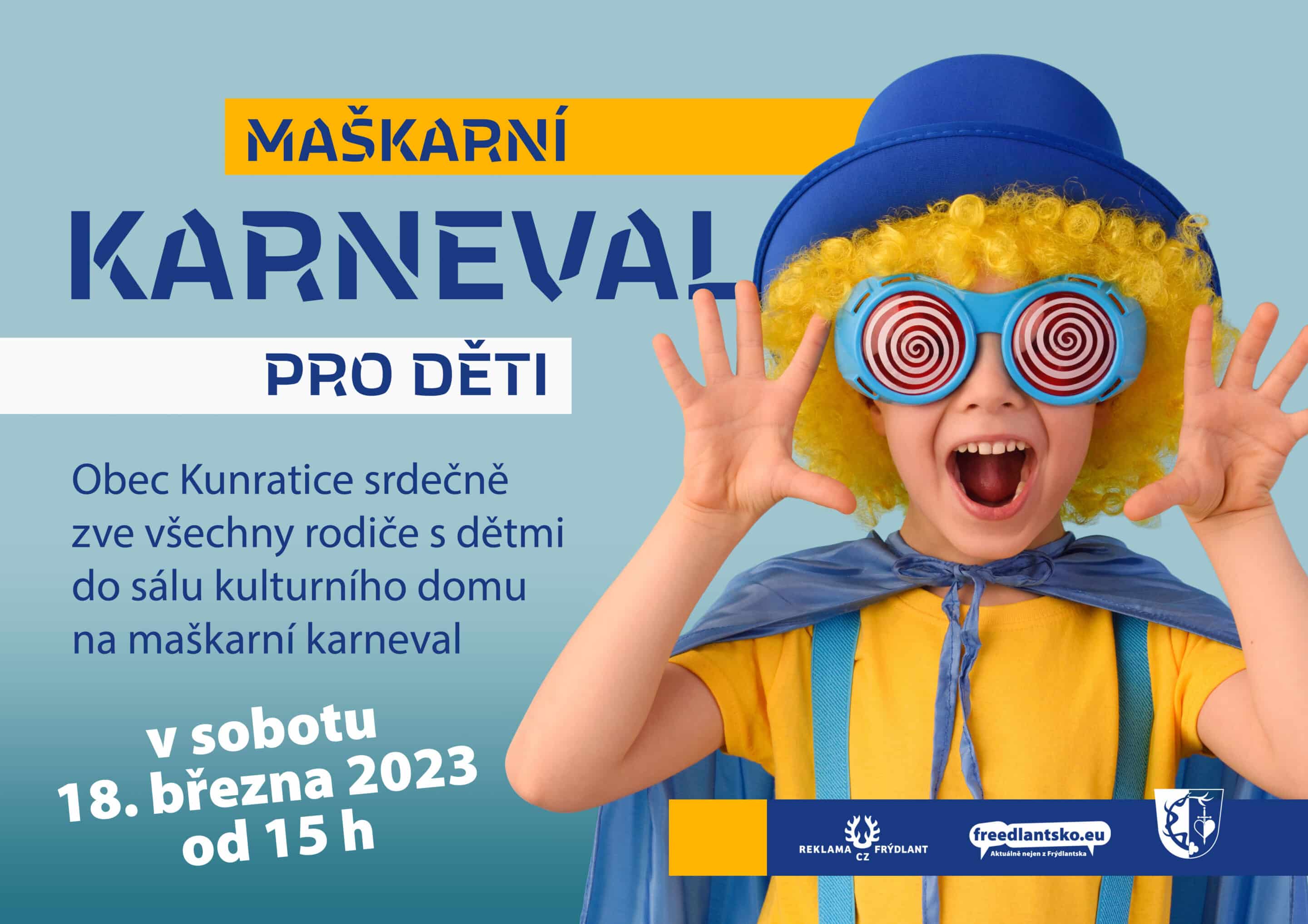 Obec Kunratice srdečně zve v sobotu 18. března 2023 od 15.00 hodin všechny rodiče s dětmi do Kulturního domu na maškarní karneval pro děti.