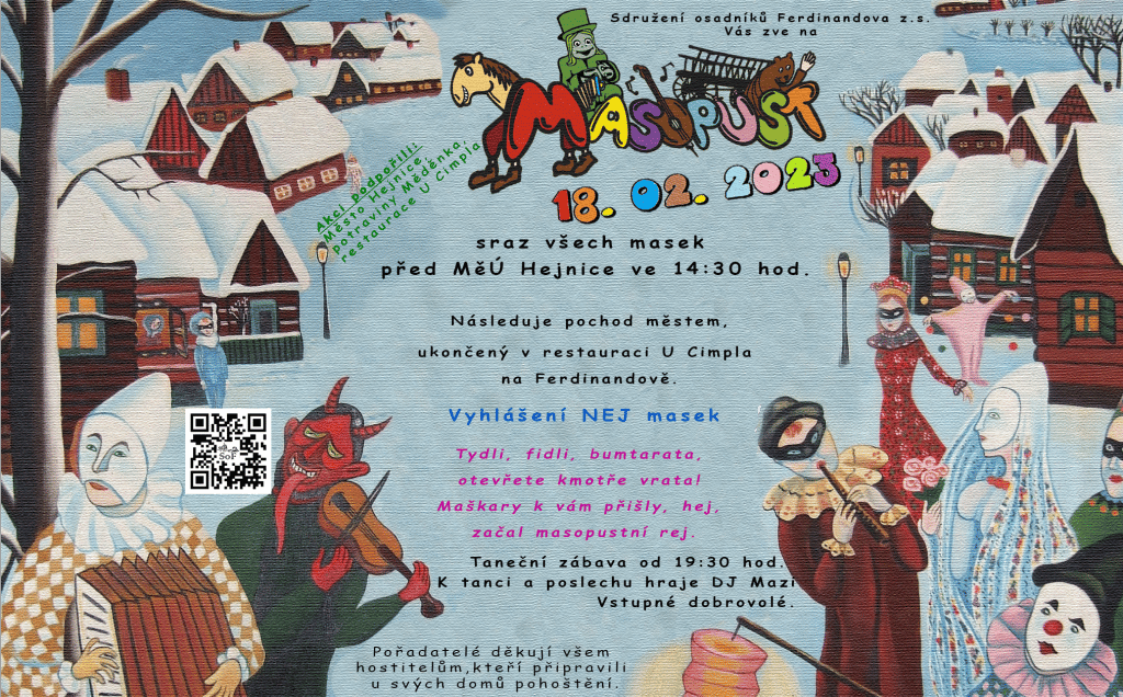 Sdružení osadníků Ferdinandova pořádá v sobotu 18. února 2023 MASOPUST. Sraz masek bude ve 14:30 hodin před Městským úřadem v Hejnicích. Následovat bude pochod městem, který bude ukončen v restauraci u