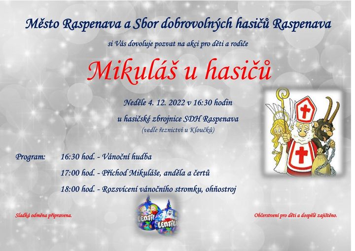Město Raspenava a Sbor dobrovolných hasičů Raspenava si vás dovolují pozvat na akci pro děti a rodiče. Mikuláš u hasičů začne v neděli 4. prosince 2022 v 16.30 hodin u hasičské zbrojnice