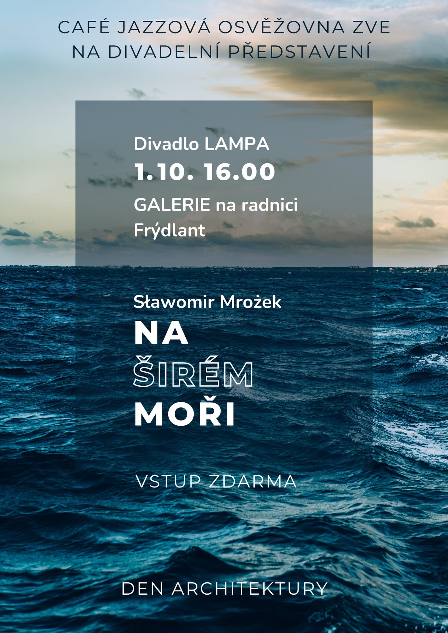 V rámci Dne architektury vás CAFé Jazzová Osvěžovna zve 1.října od 16.00 hodin na divadlo Lampa z Prahy představení Slawomira Mrozka Na širém moři v galerii na radnici ve Frýdlantu.