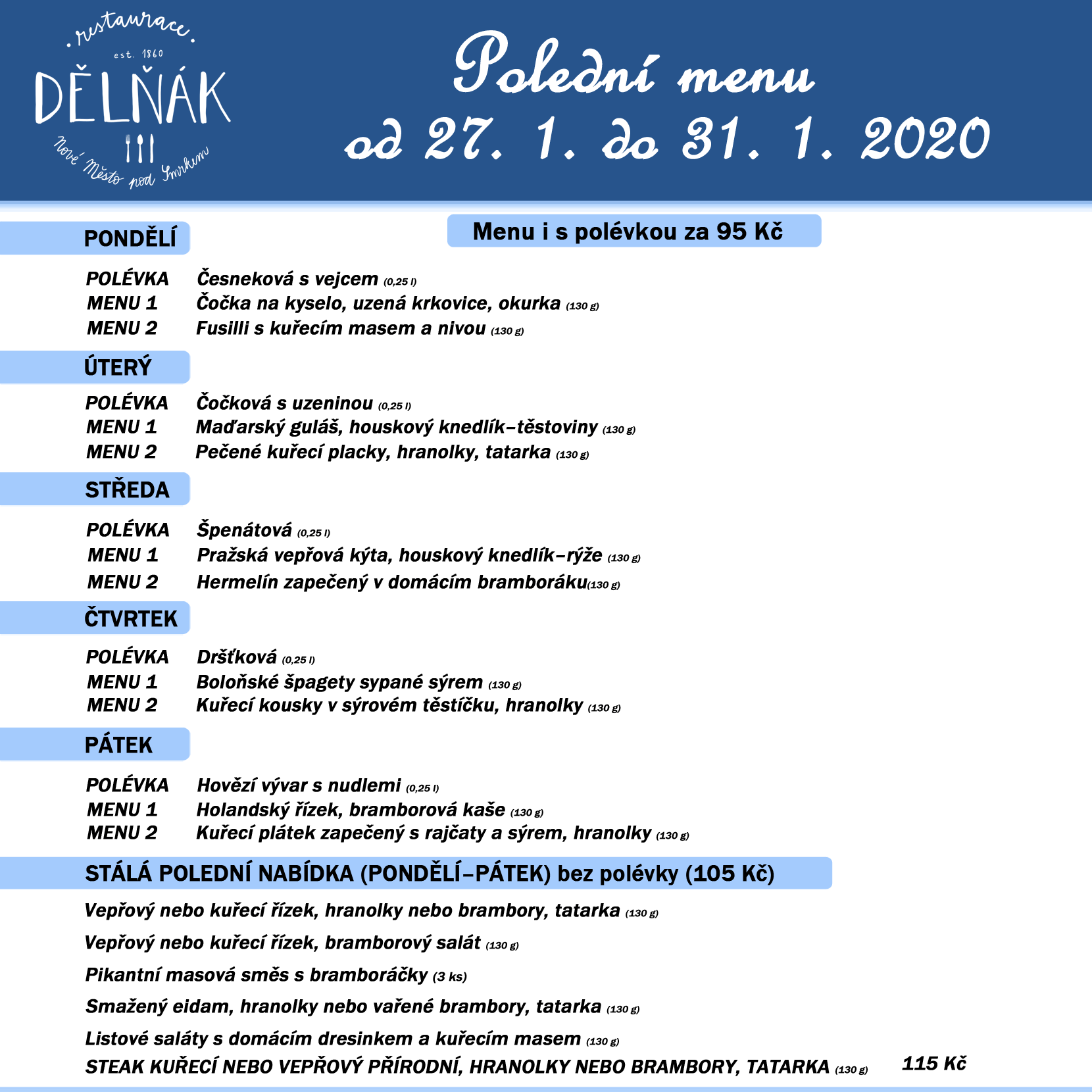 Nabídka restaurace Dělňák v Novém městě pod Smrkem 27. 1. – 31. 1. 2020 Menu i s polévkou za 95 Kč PONDĚLÍ Polévka česnekova s vejcem Cocka na kyselo, uzena krkovice, okurka Fusilli