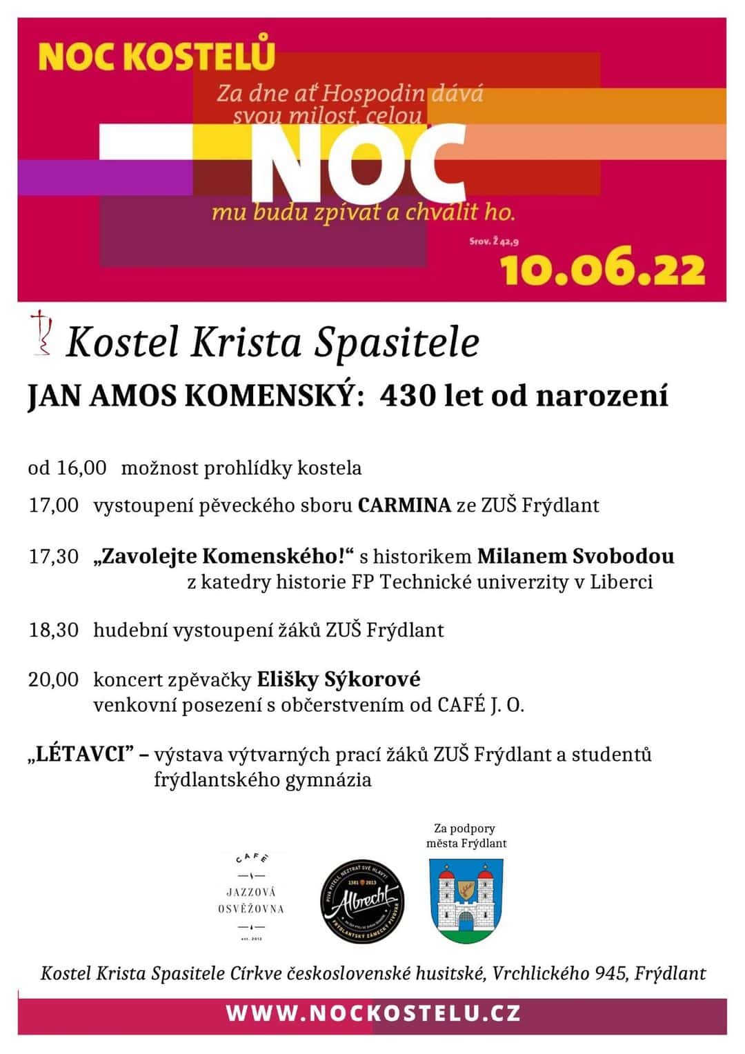 Po roce Vás zveme opět na Noc kostelů, v pátek 10.června. od 17.00 hodin, tentokrát s koncertem hudebnice Elišky Sýkorové. Kde?
