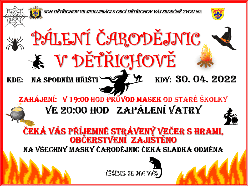 Obecní úřad Dětřichov, Sbor dobrovolných hasičů Dětřichov na Pálení čarodějnic v Dětřichově v sobotu 30. dubna 2022. Začínáme v 19.00 hodin průvodem masek od staré školky. Ve 20.000 hodin
