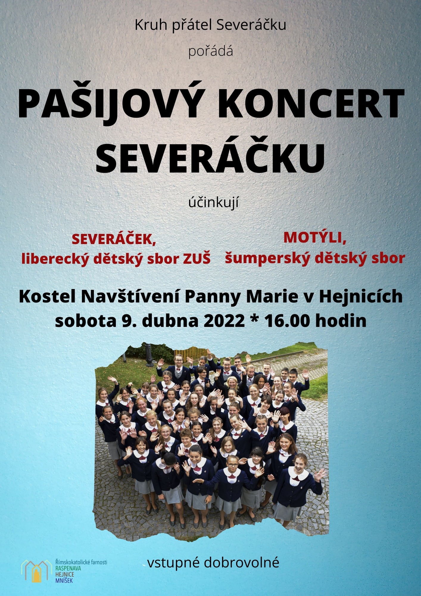 Dne 9. dubna 2022 od 16.00 hodin se koná Pašijový koncert Severáčku v Kostele Navštívení Panny Marie v Hejnicích.