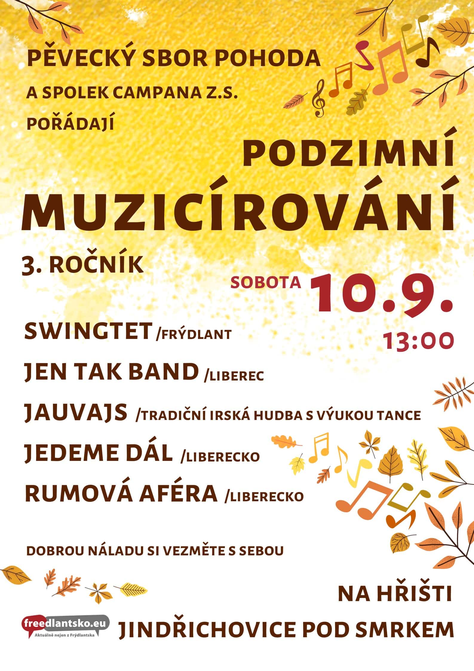 Spolek pro zvelebení jindřichovického kostela Campana, z.s. a Pěvecký sbor Pohoda pořádají v sobotu 10. září 2022 ve 13.00 hodin Podzimní muzicírování. Na hřišti v Jindřichovicích pod Smrkem se uskuteční již