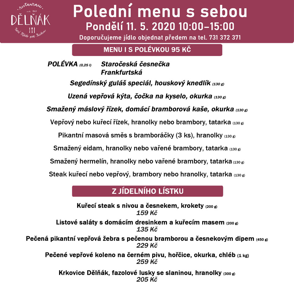 Polední menu na pondělí 11. 5., které pro Vás vaříme od 10:00 do 15:00. 🤩 Doporučujeme objednat jídlo předem na tel. 731