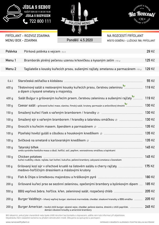 👨🍳 Kompletní menu – pondělí 4. 5. 2020 Objednávky na 📞 722 800 111 nebo osobně. Děkujeme za Vaši přízeň a podporu.
