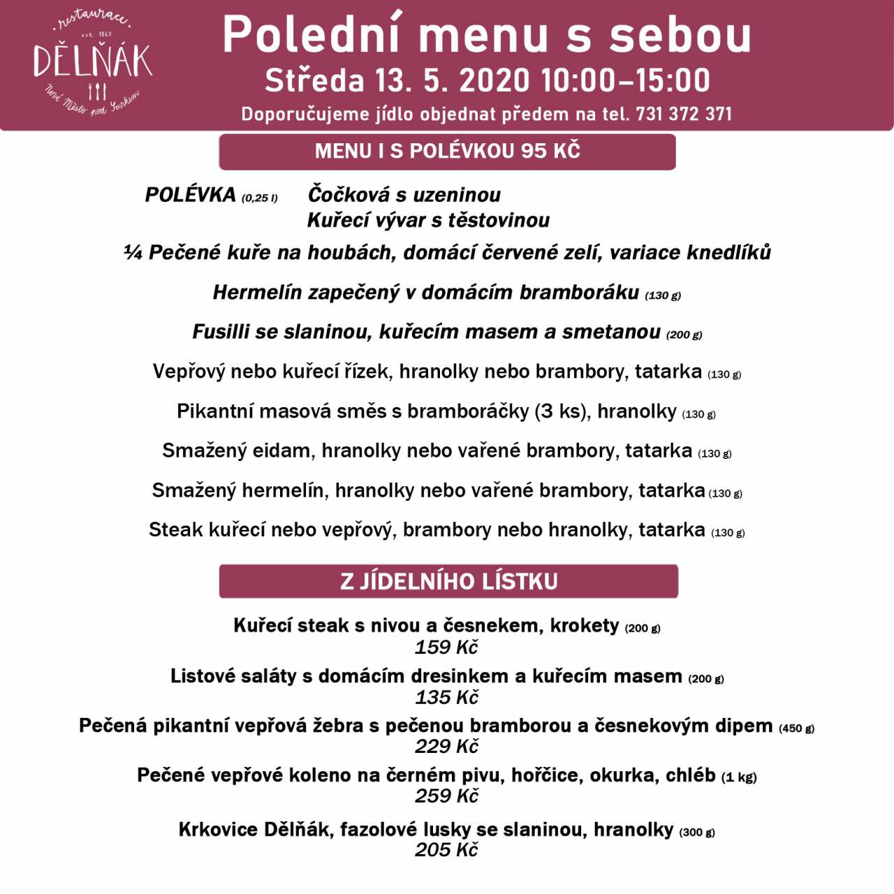 Polední menu na středu 13. 5., které pro Vás vaříme od 10:00 do 15:00. 🤩