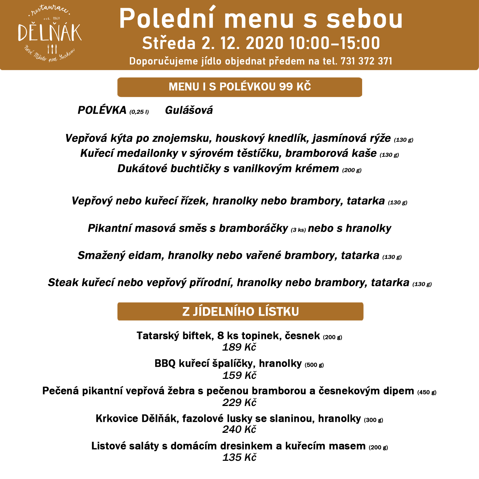 Ve středu 2. 12. od 10:00 do 15:00 vaříme toto menu, které si můžete vzít s sebou do jídlonosičů nebo menu boxů. 👌