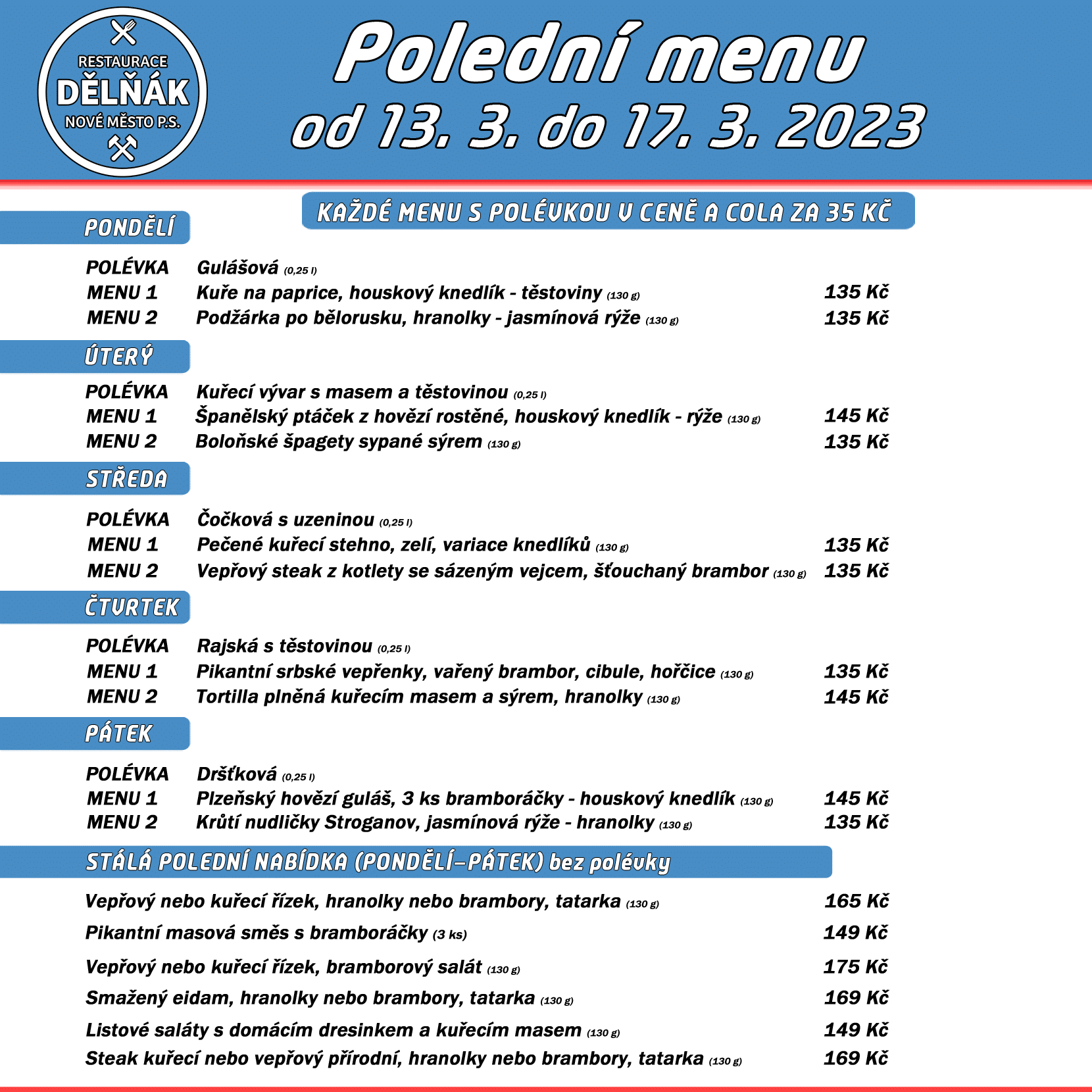 Polední menu na týden 13. až 17. března 2023 restaurace Dělňák v Novém Městě pod Smrkem