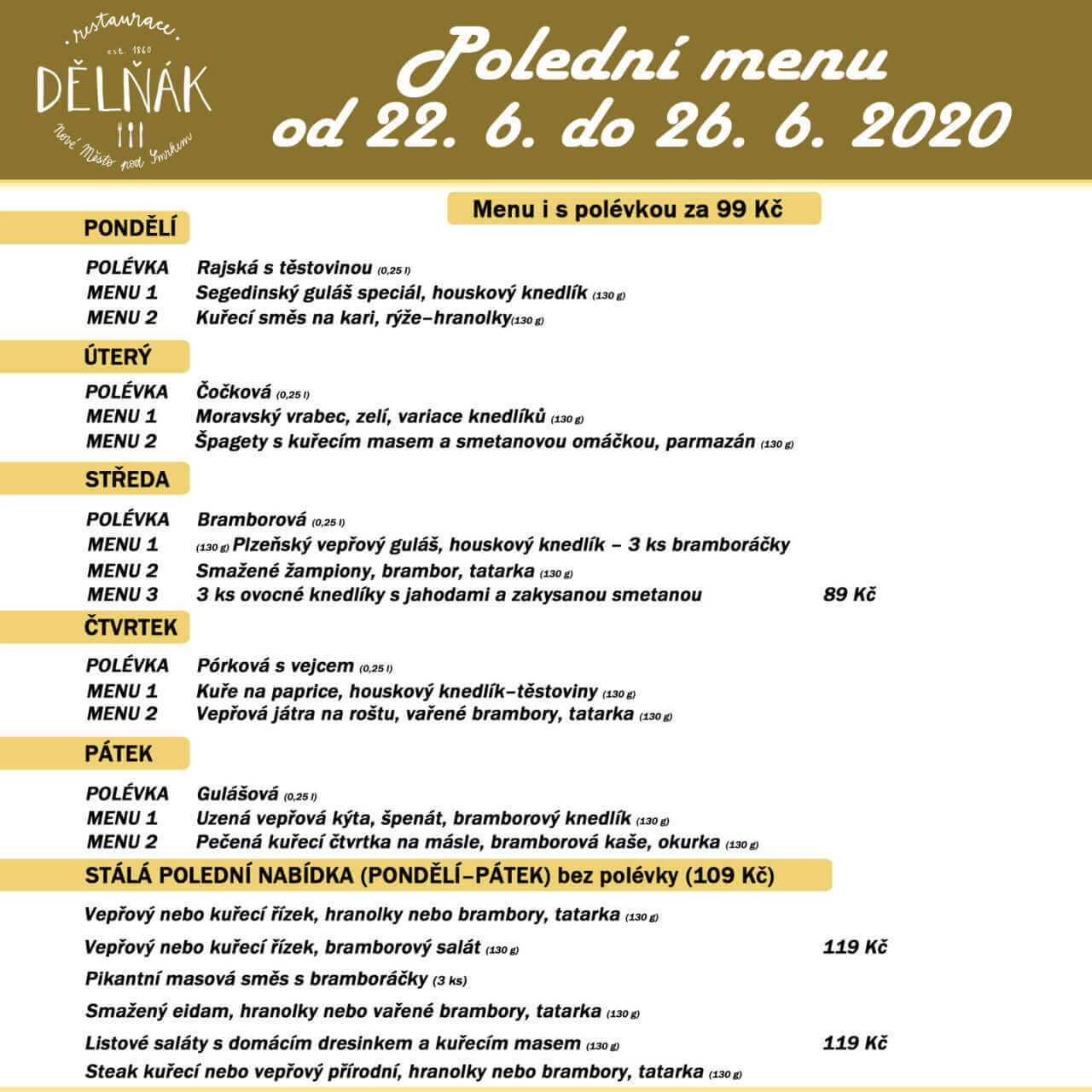 Tento týden pro Vás vaříme toto menu. Platí od pondělí 22. 6. do pátku 26. 6. 2020 každý den od od 11.00 h do 14.00 h, nebo do vyprodání
