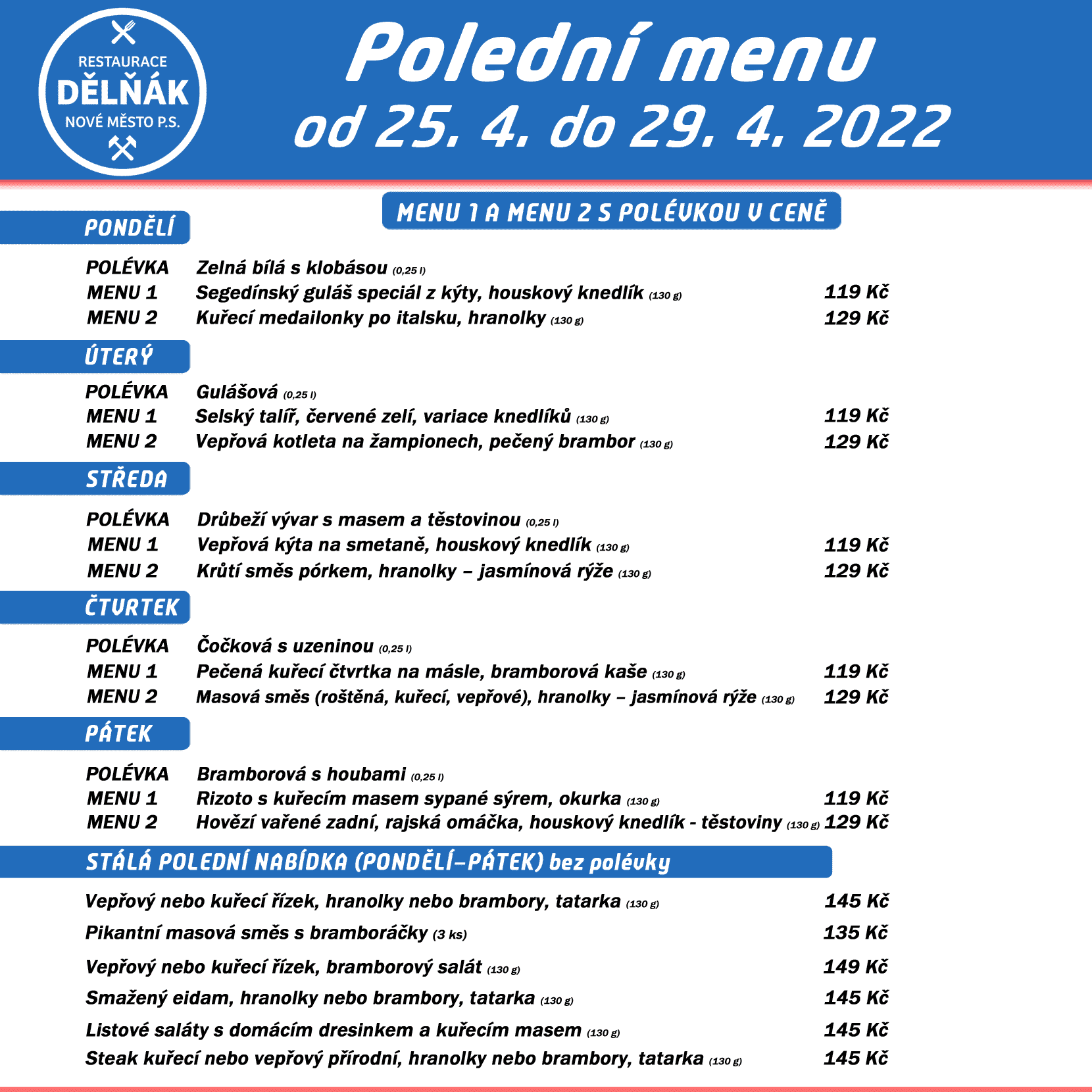Polední menu na týden 25. – 29. dubna 2022 restaurace Dělňák v Novém Městě pod Smrkem