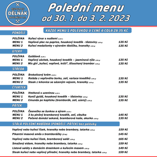 Polední menu na týden 30. ledna – 3. února 2023 restaurace Dělňák v Novém Městě pod Smrkem