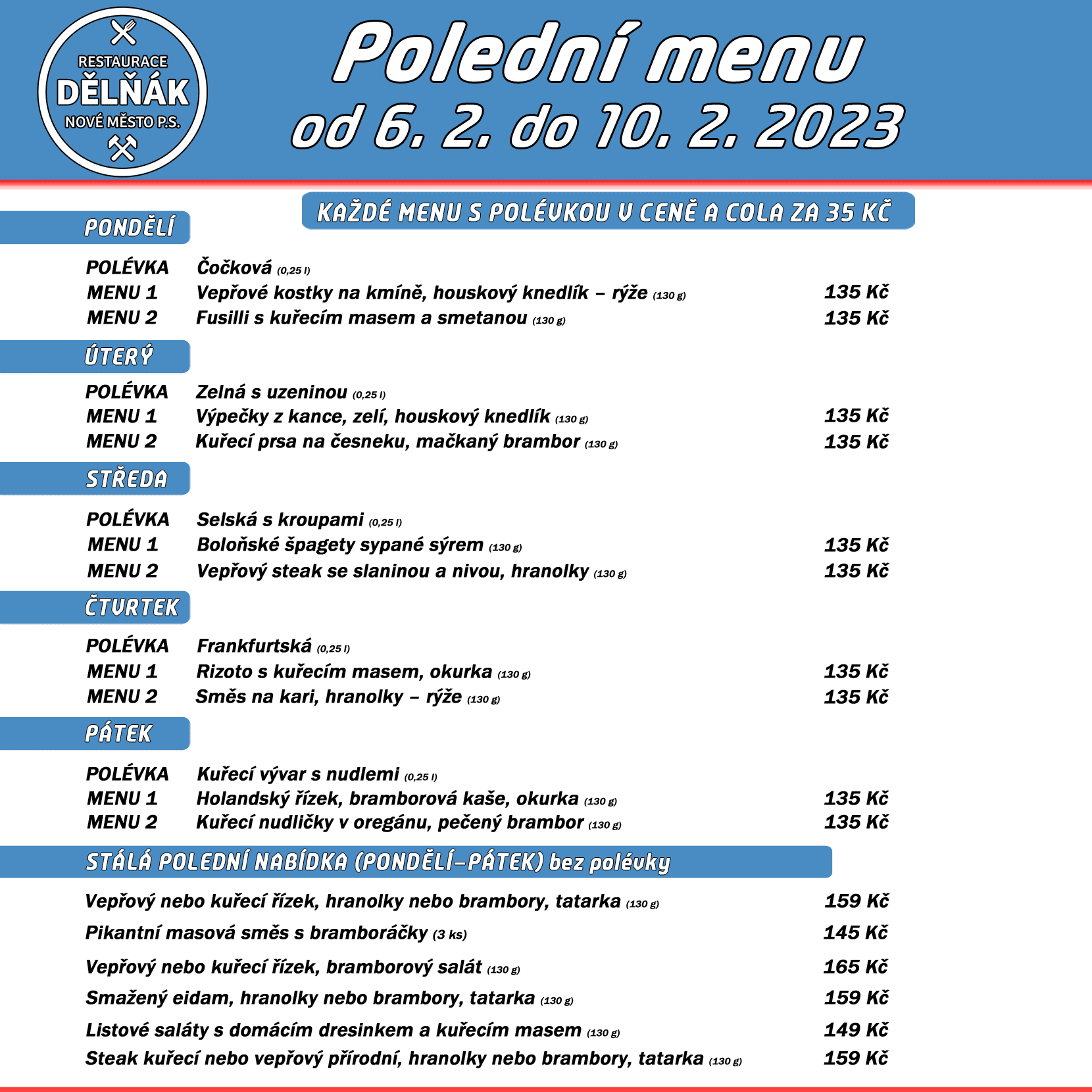 Polední menu na týden 6. – 10. února 2023 restaurace Dělňák v Novém Městě pod Smrkem