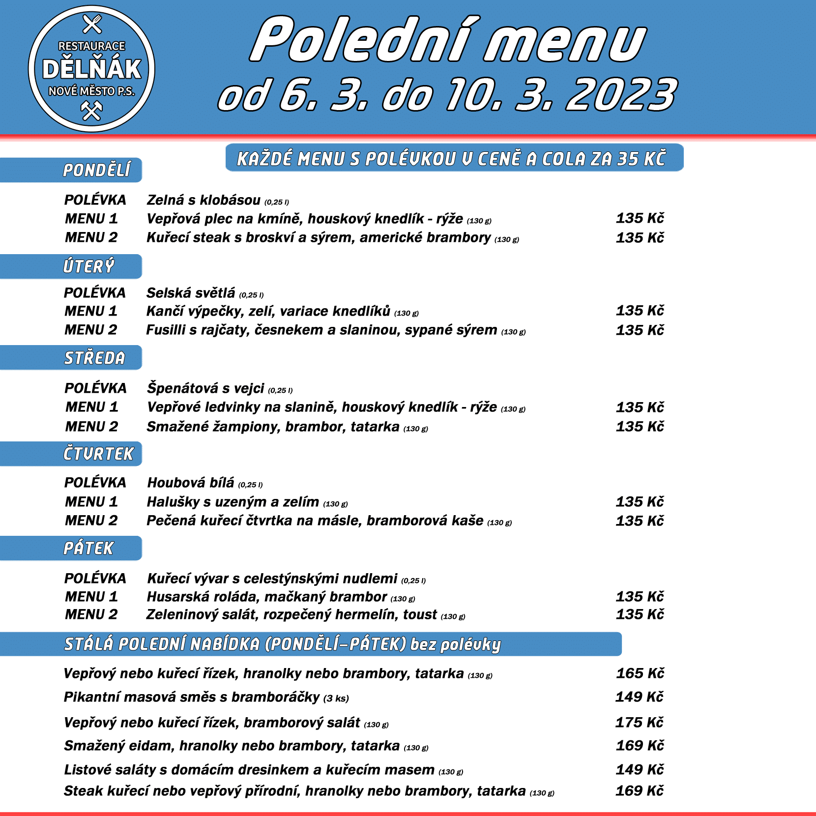 Polední menu na týden 6. až 10. března 2023 restaurace Dělňák v Novém Městě pod Smrkem