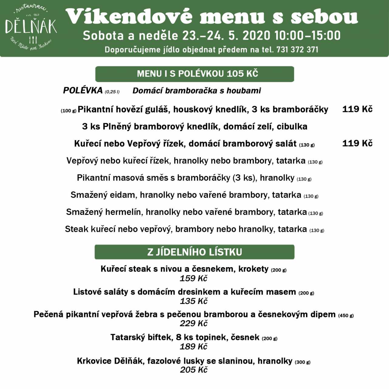 Tento víkend pro Vás vaříme toto menu. Platí od soboty 23. 5. do neděle 24. 5. 2020 každý den od 10:00 do 15:00. ☺️ Otevírací doba podle počasí do 19 hodin. 👌