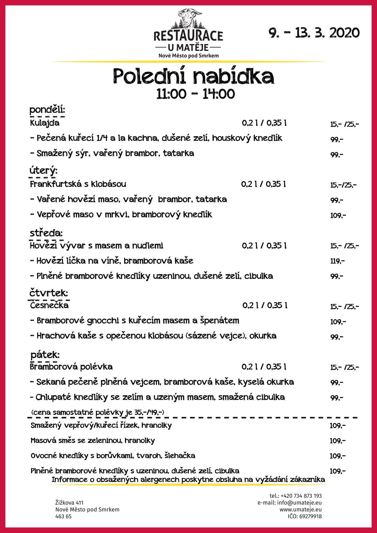 2020po09březen(březen 9)0.0013(březen 13)0.00Polední nabídka v Restauraci U Matěje v Novém Městě p. S. 9.-13. března 20200.00 - 0.00 (13)(GMT+01:00) Druh akceGastronomie,Restaurace