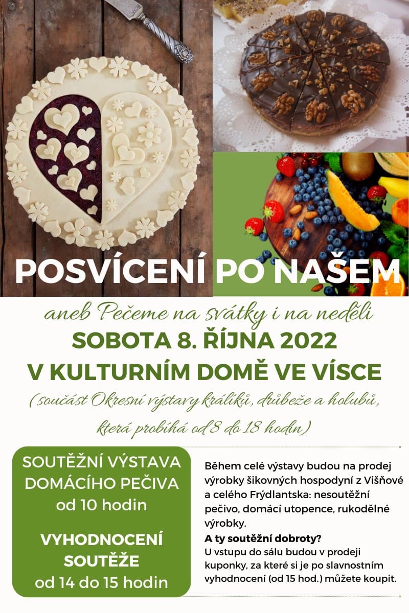 V sobotu října 2022 od 10.00 do 16.00 hodin v Kulturním domě ve Vísce Posvícení po našem, aneb pečeme na svátky i na neděli soutěžní výstava