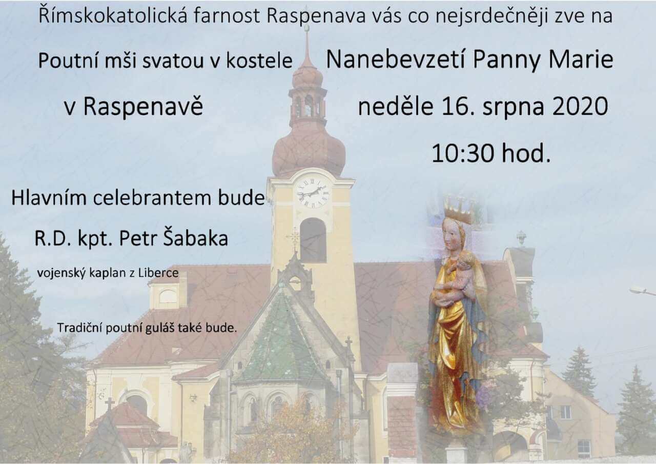 Římskokatolická farnost Raspenava Vás co nejsrdečněji zve na Poutní mši svatou v kostele Nanebevzetí Panny Marie v Raspenavě Neděle 16. sprna 2020 od 10:30 hod Hlavním celebrantem bude R. D. kpt. Petr