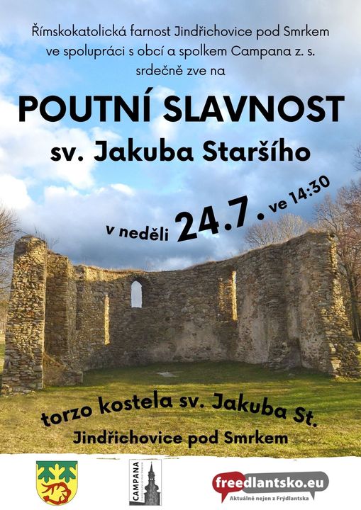 Spolek pro zvelebení jindřichovického kostela Campana, z.s. a římskokatolická farnost Jindřichovice pod Smrkem vás v neděli 24. července 2022 od 14.30 hodin srdečně zve na poutní mši v kostele sv. Jakuba.