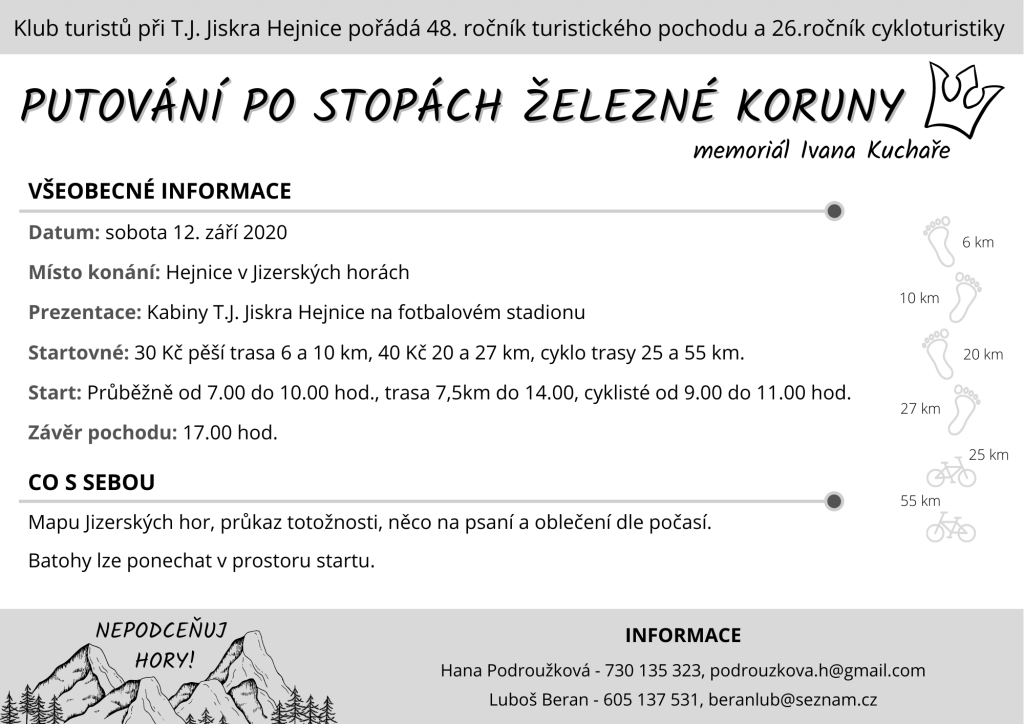 Klub turistů při T.J. Jiskra Hejnice pořádá 48. ročník turistického pochodu a 26. ročník cykloturistiky PUTOVÁNÍ PO STOPÁCH ŽELEZNÉ KORUNY memoriál Ivana Kuchaře VŠEOBECNÉ INFORMACE Datum: sobota 12. září 2020 Místo