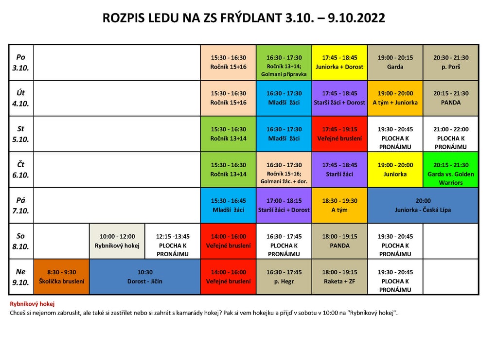 Rozpis ledu na zimním stadionu Frýdlant 3. – 9. října 2022.